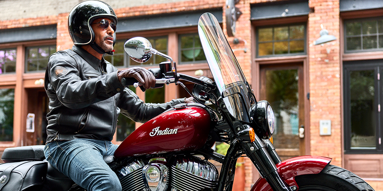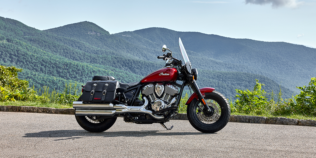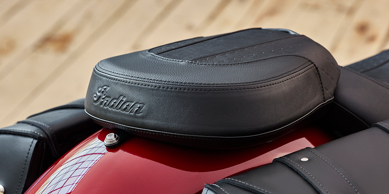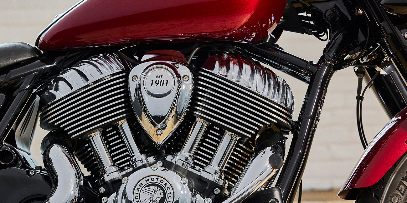 Premium-Chrom-Oberflächen, Gabelabdeckungen, Drahtspeichenräder, eine große Scheinwerfermaske und der berühmte Indian Motorcycle Schriftzug auf dem Tank.