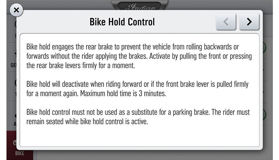 Bike Hold Control ist eine Hilfsfunktion, wenn Fahrer an einer Steigung oder einem Gefälle anhalten. Das System baut hierfür Bremsdruck auf, um ein Vor- oder Zurückrollen des Motorrads zu verhindern. Bike Hold Control kann aktiviert werden, indem man den vorderen Bremshebel oder das hintere Bremspedal kräftig betätigt. Statusmeldungen darüber, ob die Funktion verfügbar oder aktiv ist, werden über das 7-Zoll-Display in RIDE COMMAND angezeigt. Bike Hold Control funktioniert in jedem Gang, auch im Leerlauf. Die Funktion wird deaktiviert, wenn:
