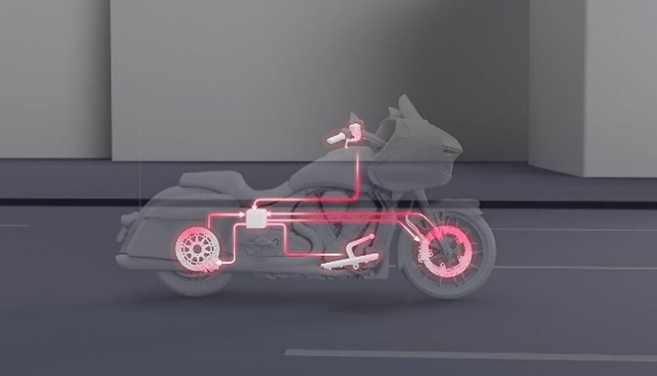 Electronically Combined Braking ist eine Funktion, die die Bremskraft des Fahrers sowie Fahrzeugparameter misst, um in jeder Bremssituation die optimale Verteilung der Bremskraft auf Vorder- und Hinterrad zu berechnen. Wenn beispielsweise nur die Vorder- oder Hinterradbremse betätigt wird, erkennt das System dies und wendet automatisch die optimale Bremskraft auf beide Bremsen an. Diese Funktion ist in die SmartLean-Technologie von Indian Motorcycle integriert, sodass die optimale Bremswirkung sowohl auf geraden Strecken als auch in Kurven gewährleistet ist.