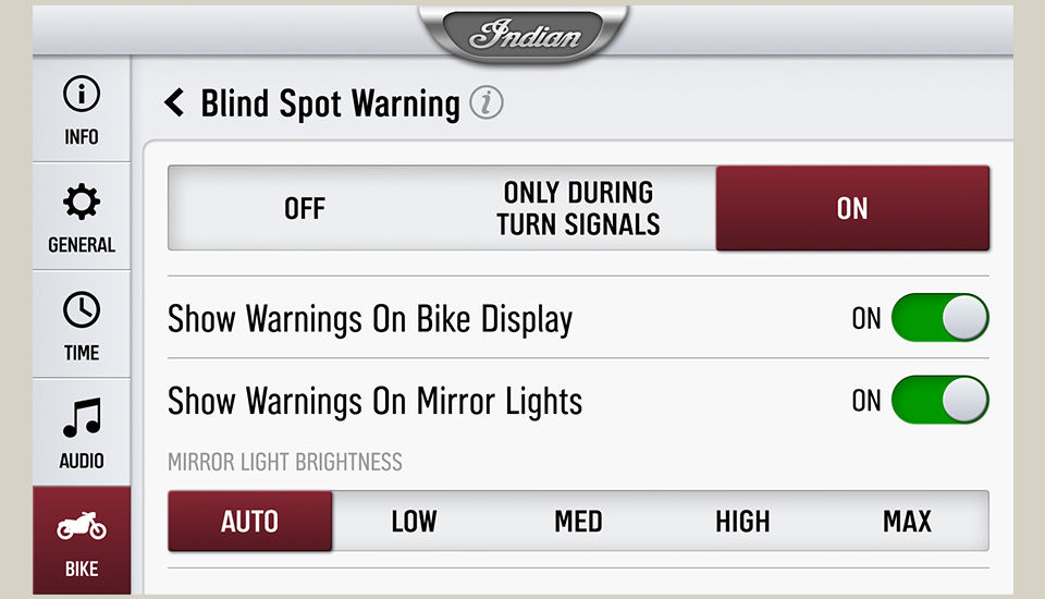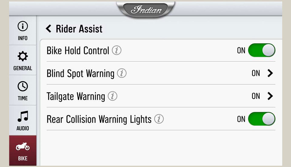 Die Konfiguration der Fahrerassistenzfunktionen kann über den Bildschirm der Rider Assist Einstellungen aufgerufen werden. Weitere Anpassungen der Funktionen „Blind Spot Warning“ und „Tailgate Warning“ sind über das Untermenü der ausgewählten Funktionen möglich.
