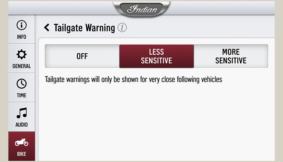 Tailgate Warnung ist eine Funktion, die den Fahrer über das 7-Zoll-Display der RIDE COMMAND App informiert, wenn sich ein Fahrzeug mit hoher Geschwindigkeit von hinten nähert und zu dicht auffährt. Es gibt zwei verschiedene Warnstufen für die Auffahrwarnung. Welche der beiden Warnungen angezeigt wird, hängt von der Geschwindigkeit des Motorrads und dem relativen Abstand des nachfolgenden Fahrzeug ab. Die Auffahrwarnung kann im Einstellungsmenü von Rider Assist deaktiviert werden. Die angezeigte Warnstufe richtet sich nach der Entfernung des Auffahrens.